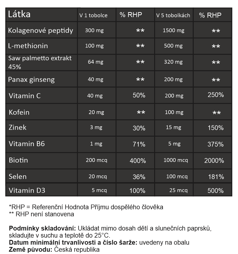 kolagenové peptidy (vepřové), L-methionin, Saw palmetto extrakt (extrakt z plodů Serenoa repens, 45% mastných kyselin), Ženšen pravý extrakt (extrakt z kořene Ginseng P.E., 25% ginsenosidů), kyselina askorbová(vitamin C), kofein, citrát zinečnatý (zinek), pyridoxin hydrochlorid (vitamin B6), biotin (vitamin H), seleničitan sodný (selen), cholecalciferol (vitamin D), plnivo (mikrokrystalická celulóza), protispékavá látka (hořečnaté soli mastných kyselin), želatinová tobolka