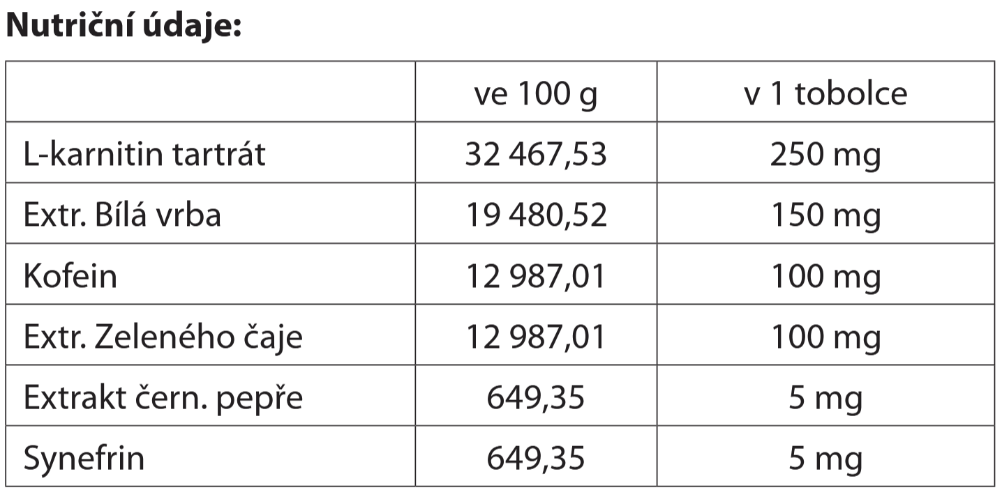 250 mg L-karnitinu, 100 mg kofeinu a 100 mg extraktu zeleného čaje v 1 tobolce